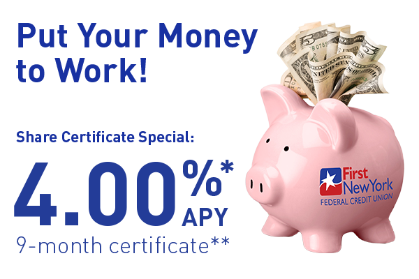 With First New York’s super competitive Share Certificate of Deposit rates, you can find the perfect term and rate to meet your short- or long-term savings goals. To open a certificate, you can visit a branch or contact the Contact Center.